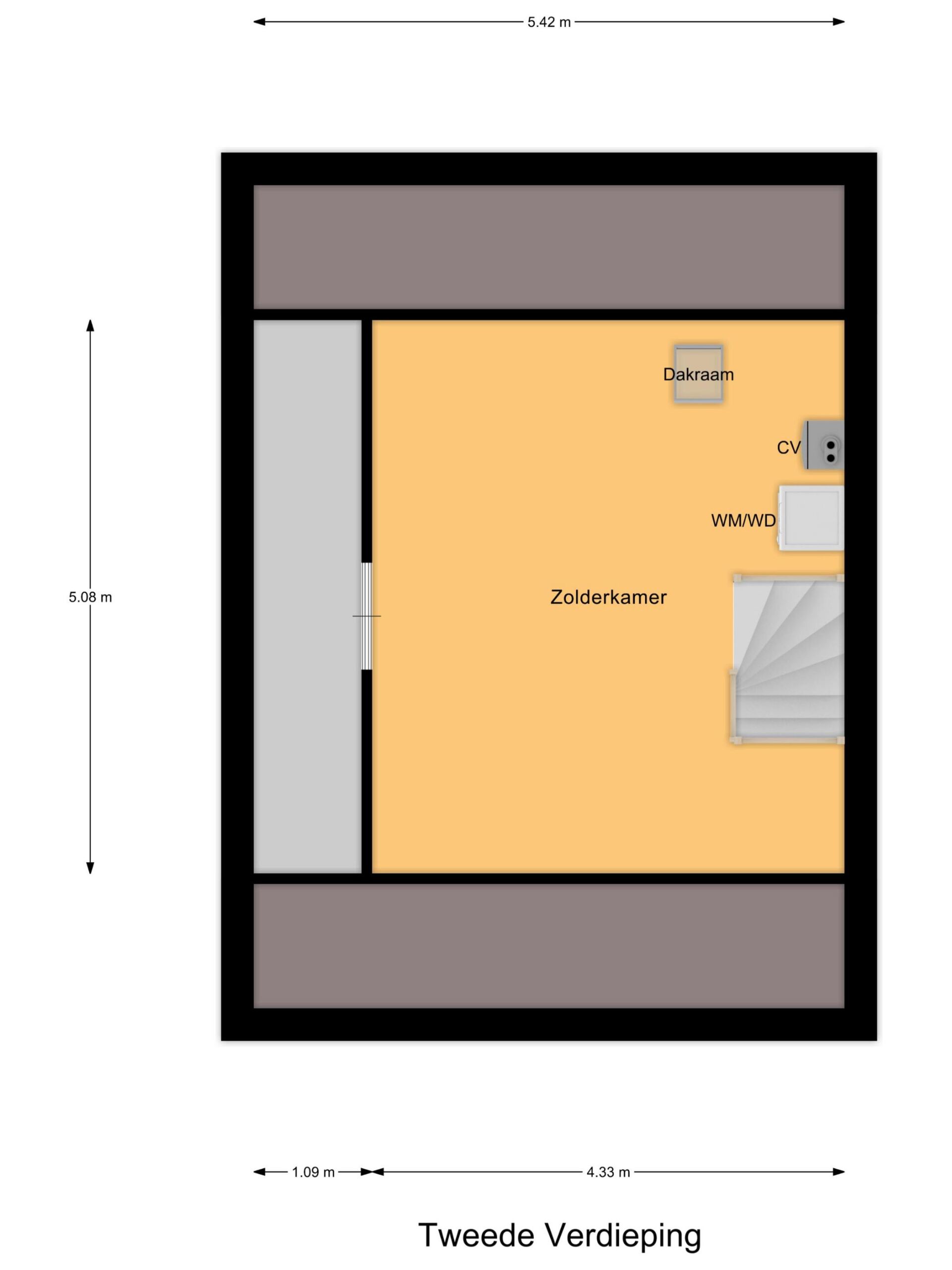 Tweede verdieping: middels vaste trap te bereiken zolderverdieping v.v. dakraam en aansluitingen voor Cv-ketel en wasmachine-/droger. Een afgesloten (berg)ruimte zorgt voor voldoende bergruimte. Deze zolder is ook uitermate geschikt voor het realiseren van een 4e slaapkamer.