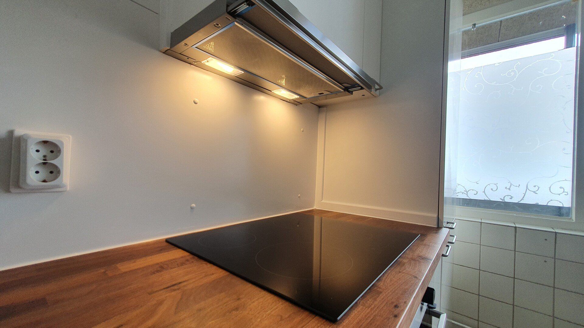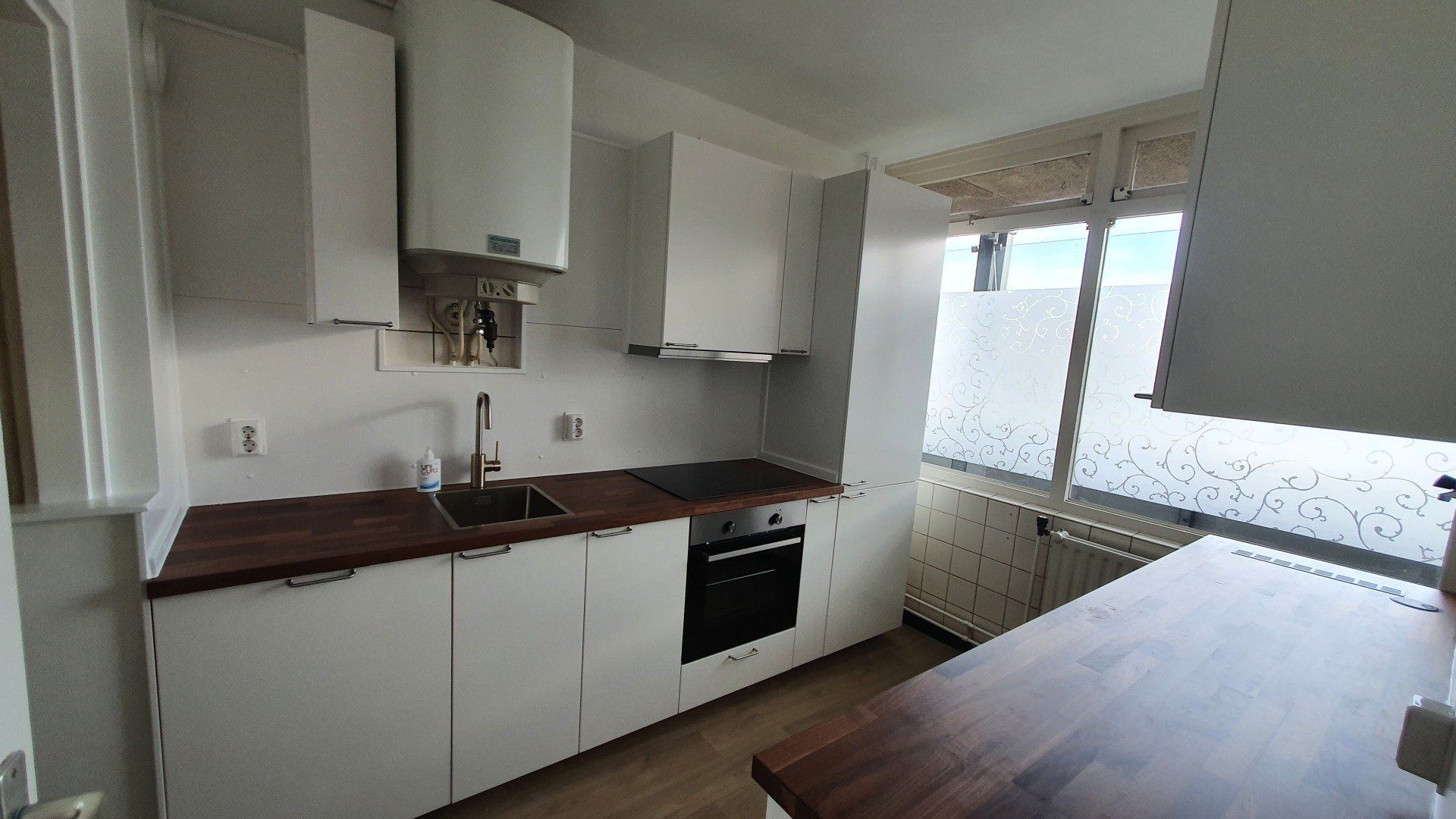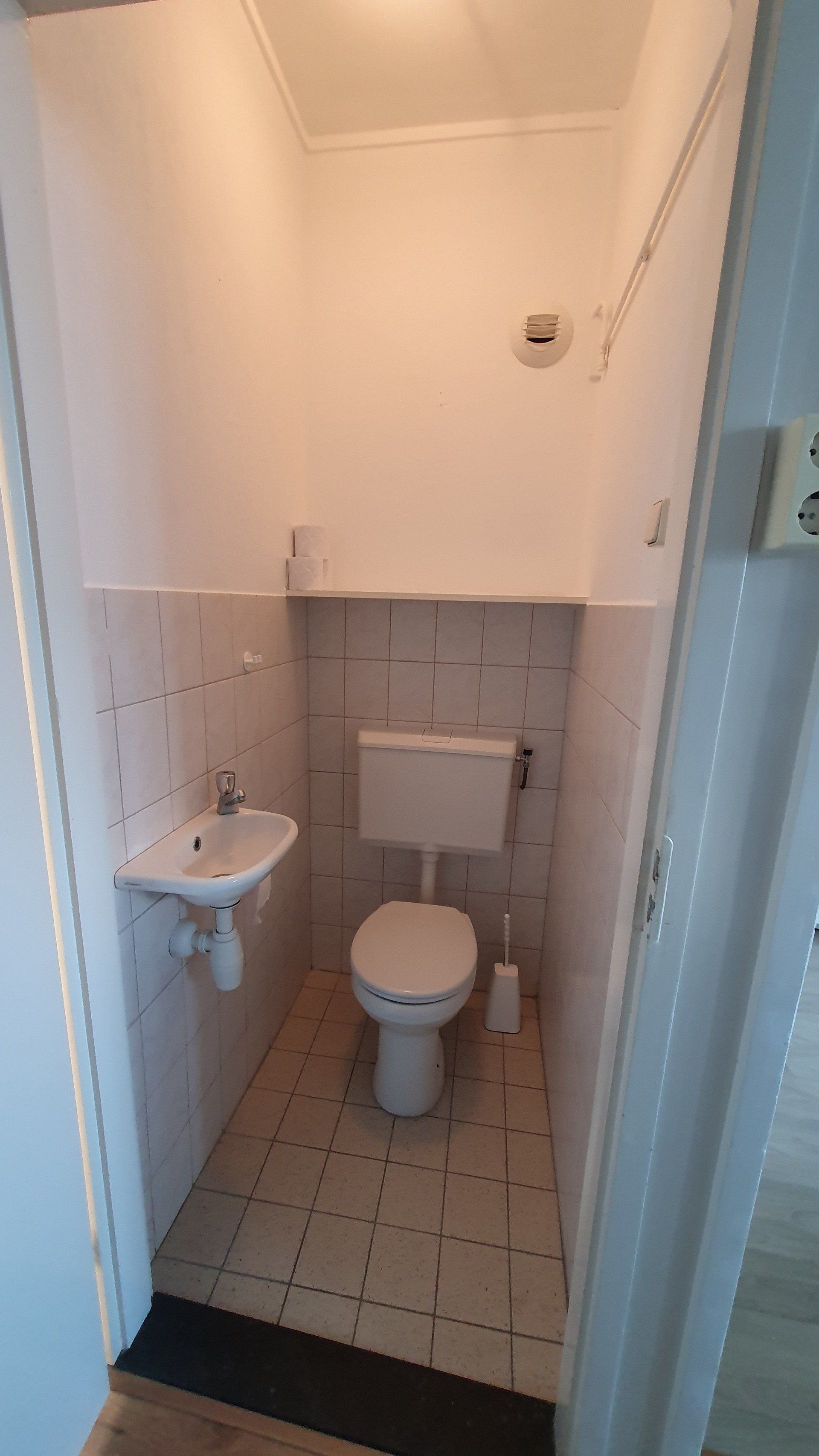 hal met laminaatvloer, toilet, nieuw keukenblok met alle apparatuur en lichte woonkamer met