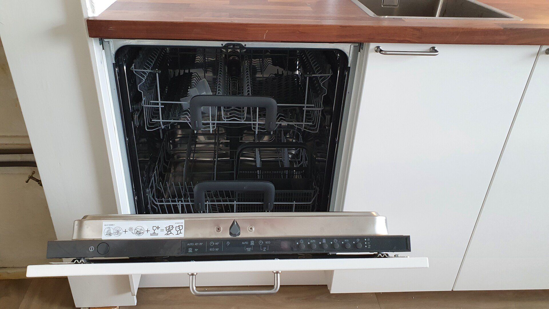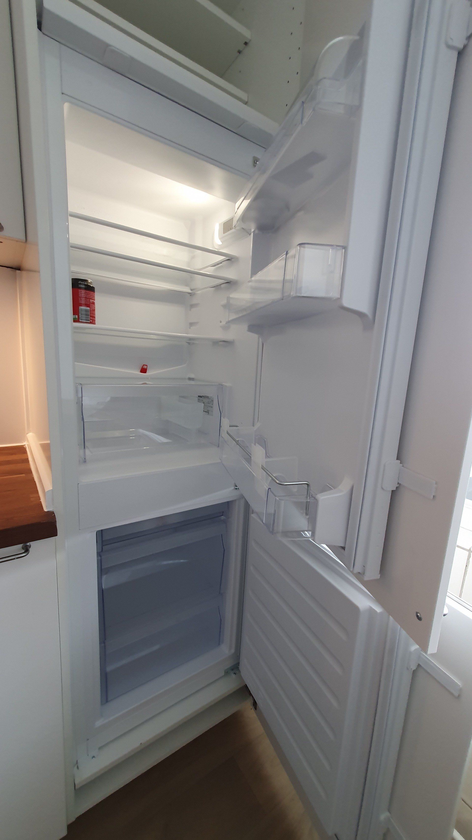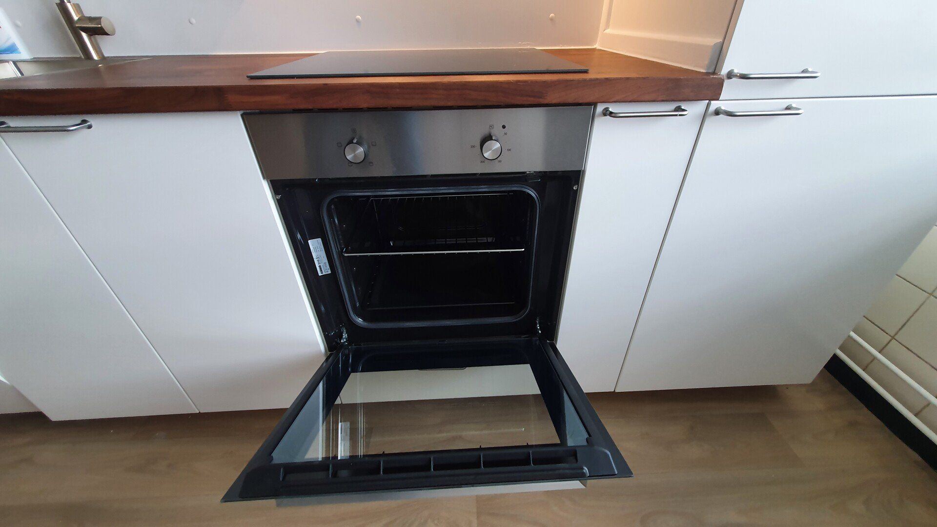 hal met laminaatvloer, toilet, nieuw keukenblok met alle apparatuur en lichte woonkamer met